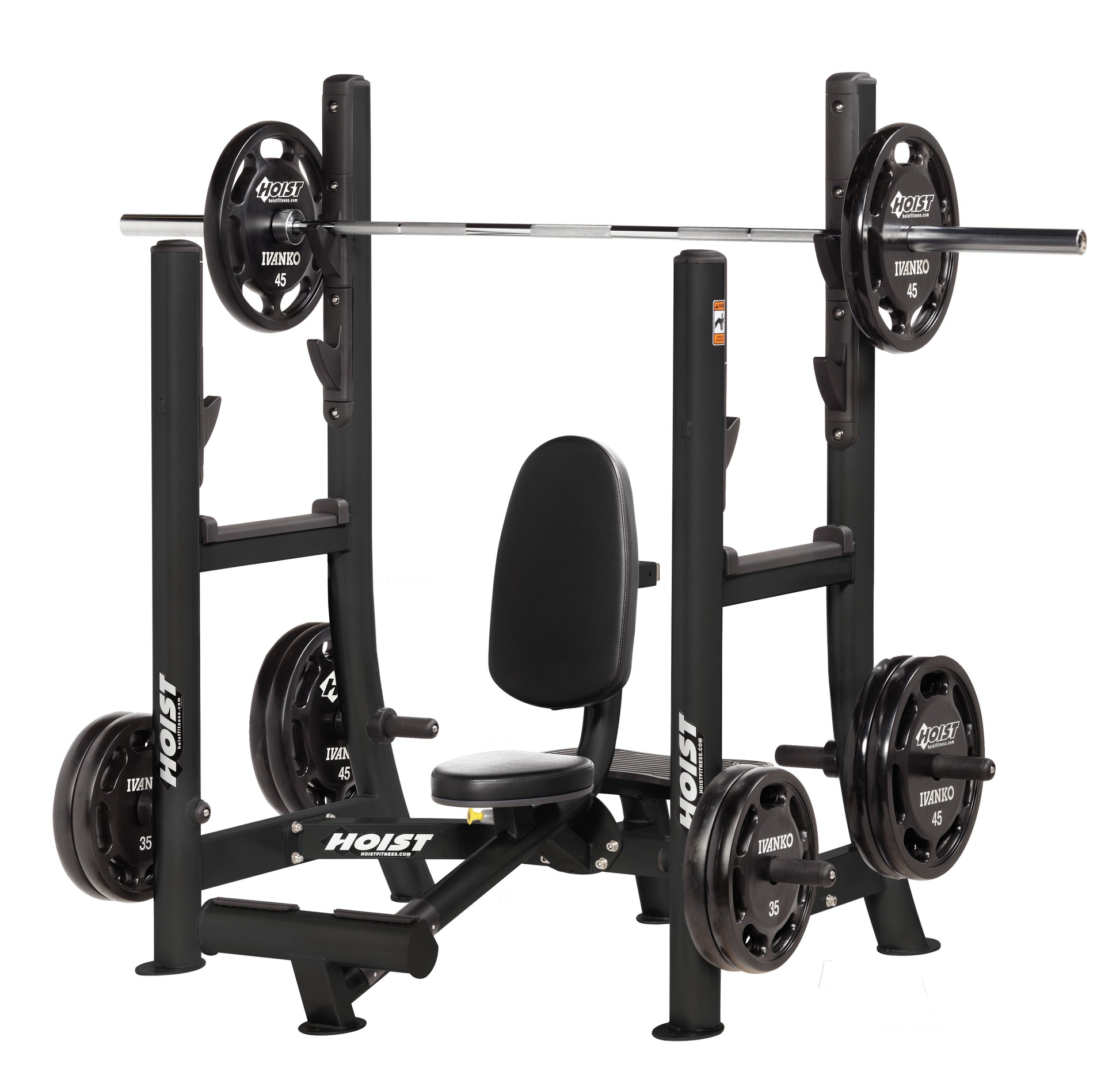 - Integrated weight storage with six Olympic plate holders